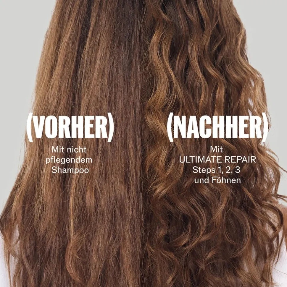 - Step 1: Reinigen & vorbereiten – Das Haar wird mit dem Ultimate Repair Shampoo gereinigt und auf die Pflegeroutine vorbereitet. Das Creme-Shampoo mit Metal Purifier Technologie befreit die Haare von Metallen, Verunreinigungen und Schadstoffen. Um das Shampoo leichter einzuarbeiten, das trockene Haar vorab bürsten. Anschließend das Shampoo im nassen Haar aufemulgieren und von der Kopfhaut bis in die Haarspitzen verteilen. Die Anwendung kann ruhig wiederholt werden, denn hier gilt: lieber zweimal mit einer kleineren Menge shampoonieren als einmal mit mehr Produkt.